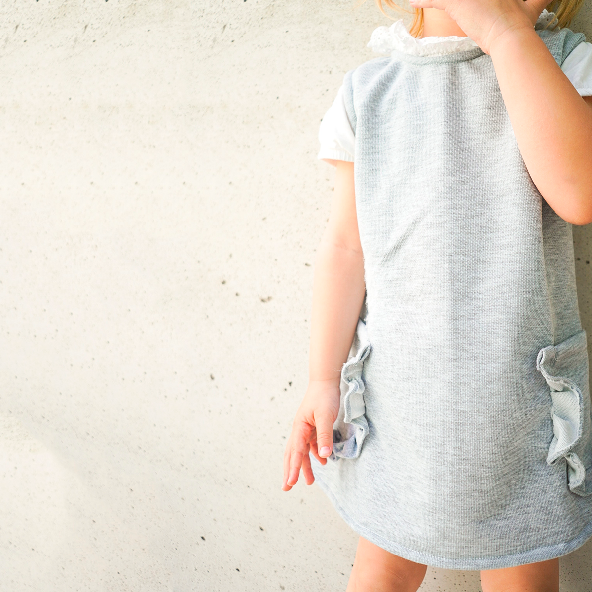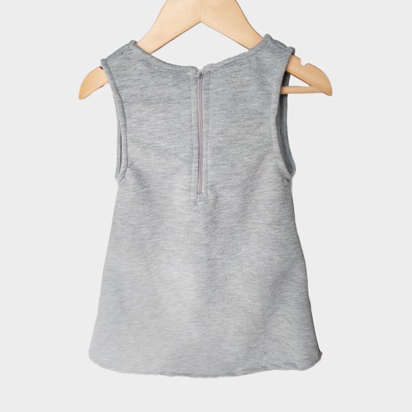 Jumper confeccionado en rústico gris claro, con bolsillos con volados y cierre en la espalda. Disponible del T2 al T14.