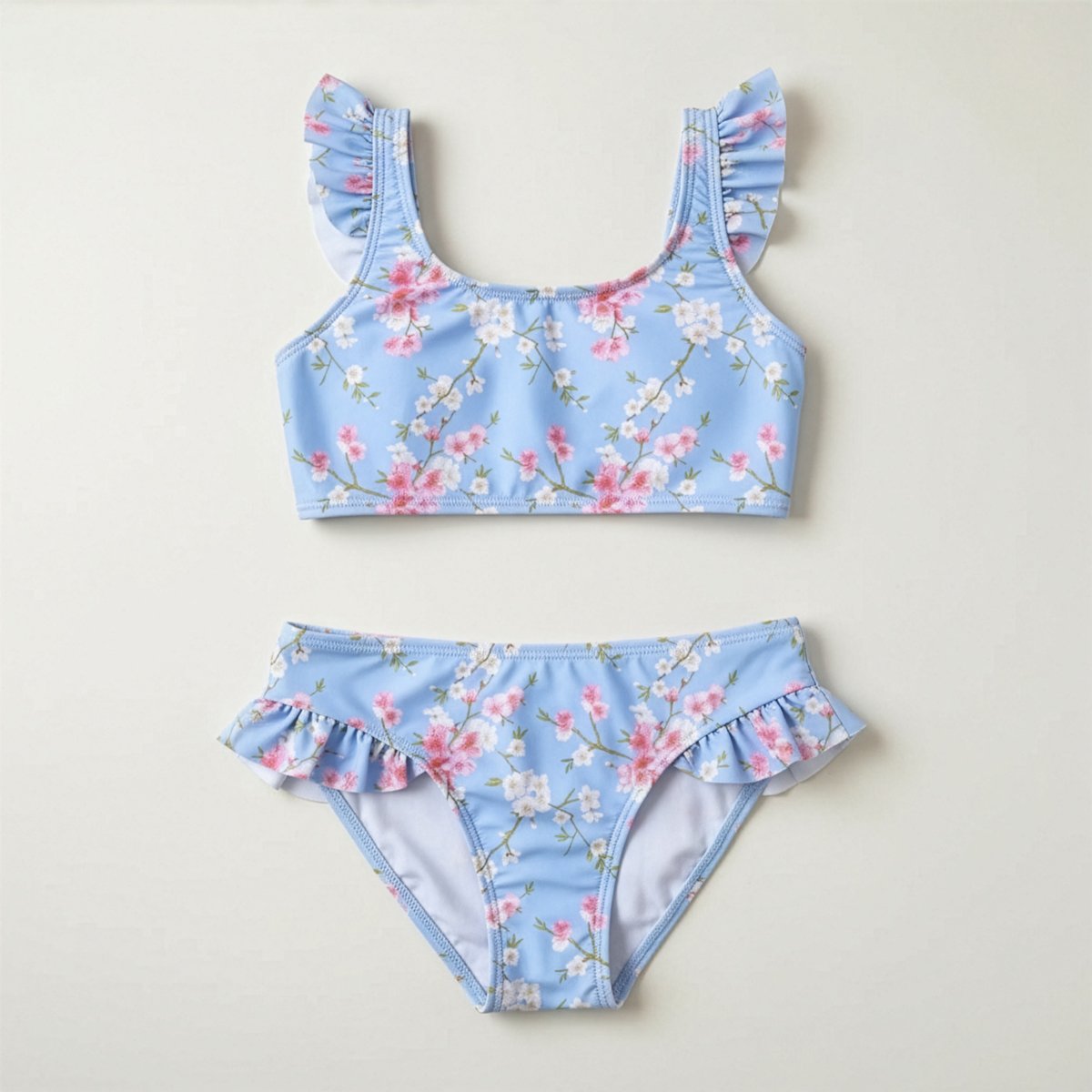Malla bikini con volados en breteles y cadera. Forrada completamente.