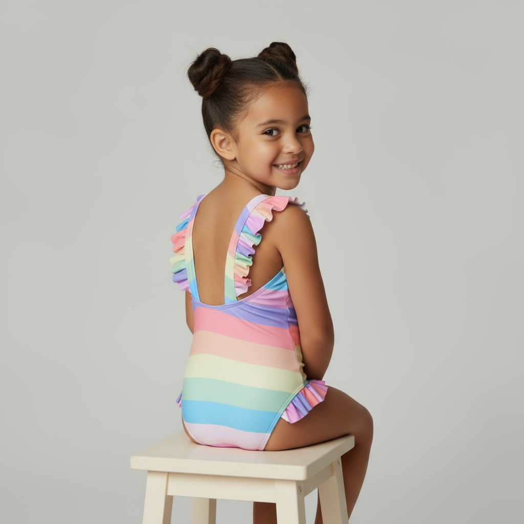 Malla enteriza con volados en cadera y hombros, con un hermoso diseño arcoiris. Confeccionada en Tricot de Lycra FPS +50 y protección Anticloro. Completamente forrada. La nueva temporada viene con las tiras de la espalda rectas.