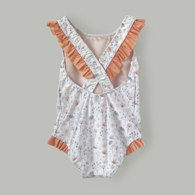 Malla entera con espalda cruzada y volados en hombros y cadera. Confeccionada en lycra tricot blanca y forrería interna solo en la parte delantera.