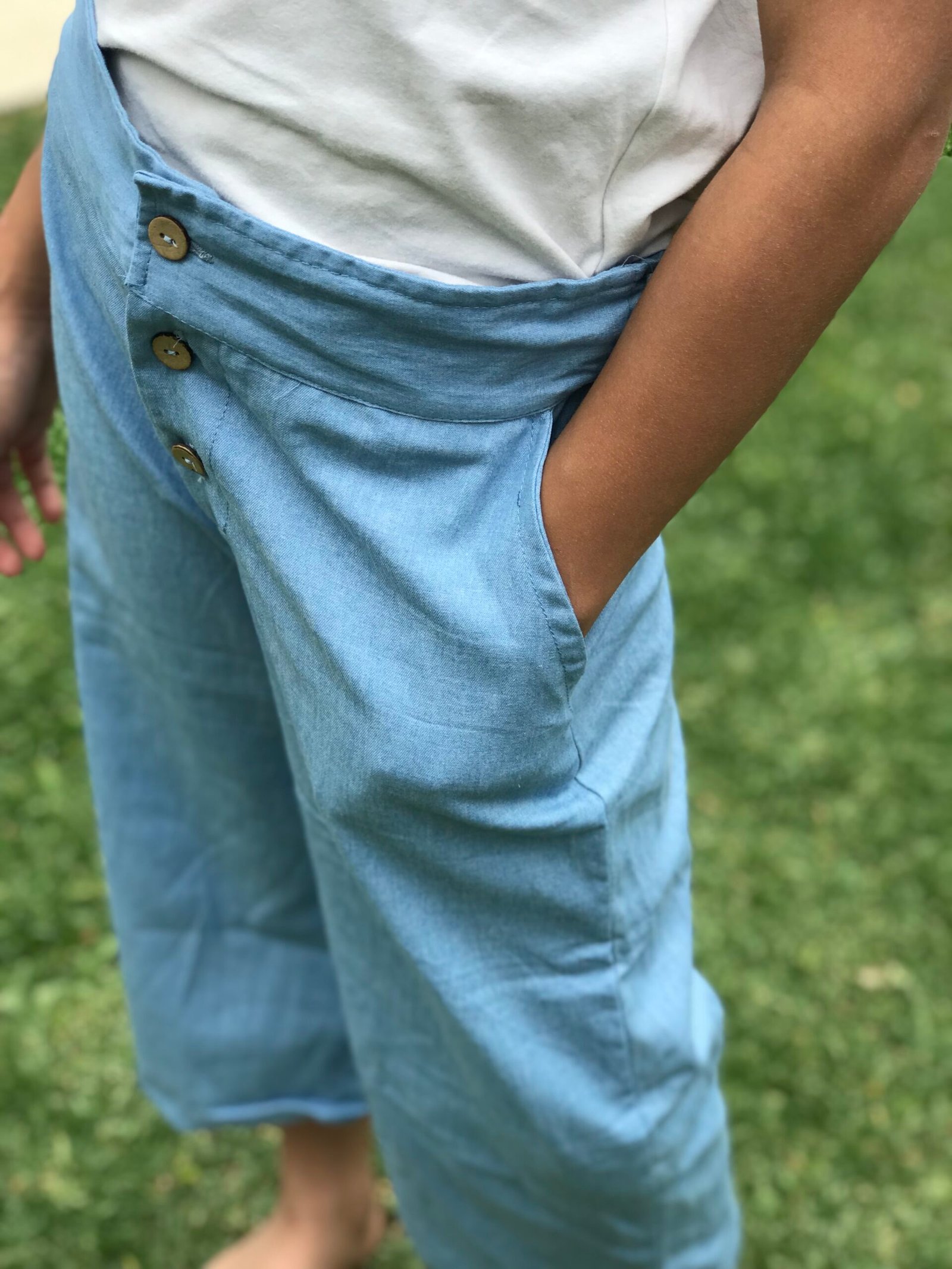 Palazzo confeccionado en denim liviano super fresco para verano. Disponible en celeste y azul.